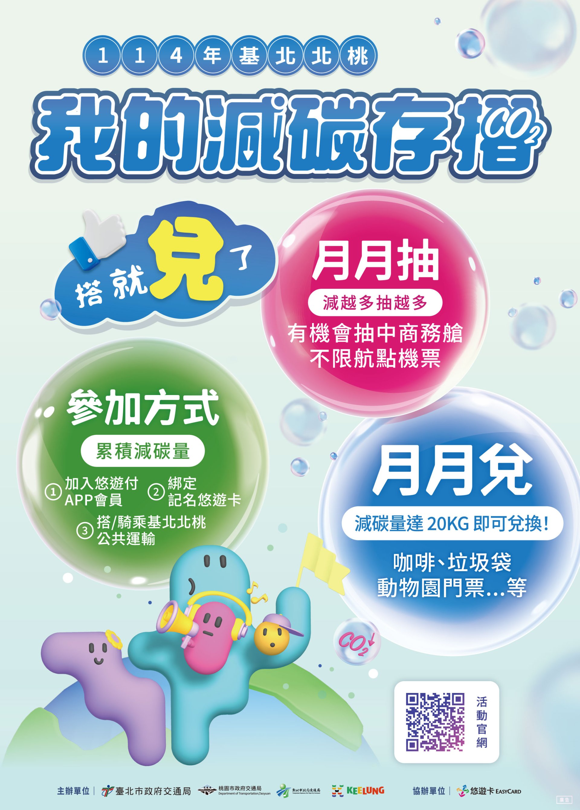 | 二、 | 為攜手市民多加使用公共運輸,以朝淨零碳排目標前進 ,由政府、企業一起帶動全民綠運輸減碳,113年由基北北桃四市交通單位、公共運輸業者及悠遊卡股份有限公司共同推動,114年度擴大辦理並增加兌獎制活動,民眾累積達一定減碳量即可登錄兌換獎項,提高民眾參與誘因,活動辦理期間114年1月1日至12月31日止,詳細內容可至本活動官網查閱114年活動資訊( https://co2- passbook.com/)。 |