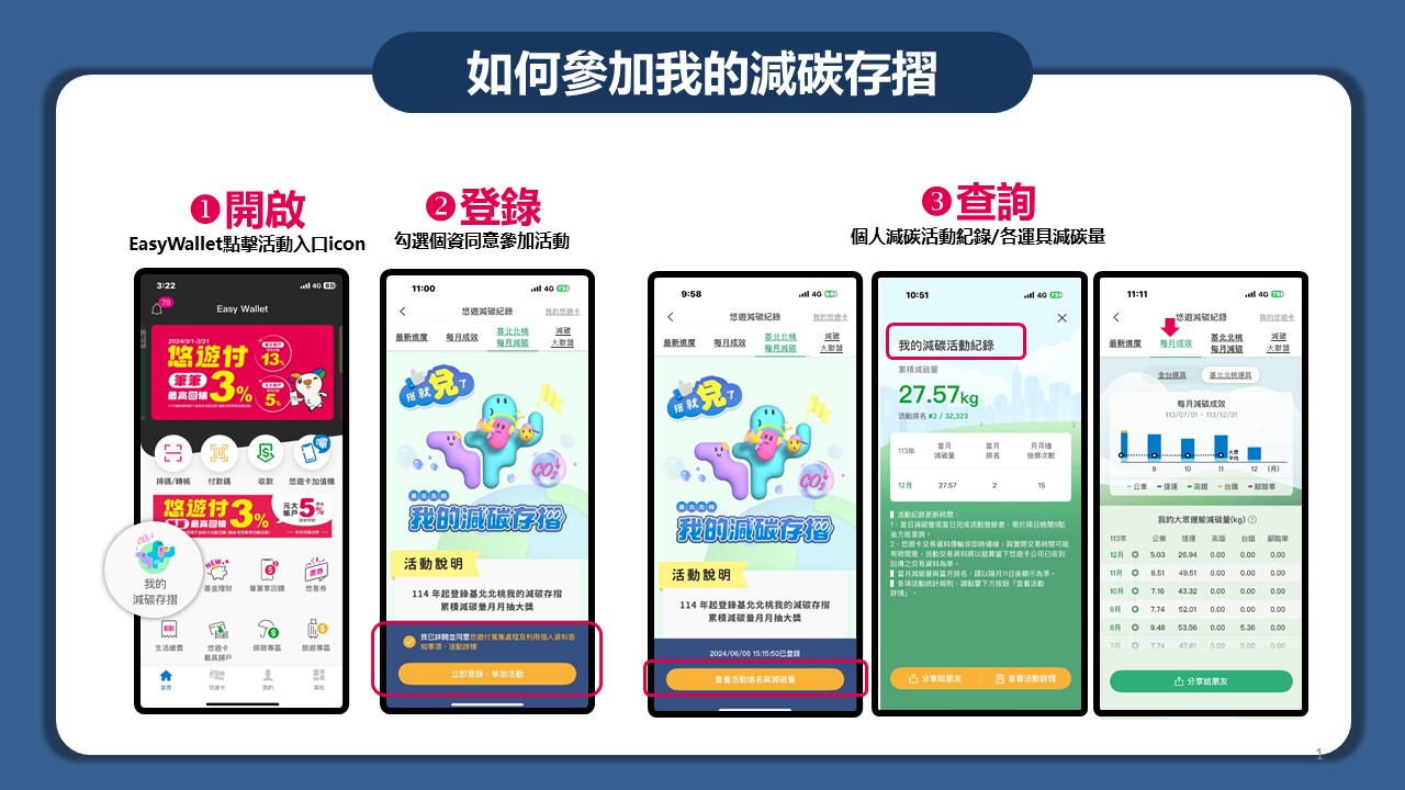 二、 | 為攜手市民多加使用公共運輸,以朝淨零碳排目標前進 ,由政府、企業一起帶動全民綠運輸減碳,113年由基北北桃四市交通單位、公共運輸業者及悠遊卡股份有限公司共同推動,114年度擴大辦理並增加兌獎制活動,民眾累積達一定減碳量即可登錄兌換獎項,提高民眾參與誘因,活動辦理期間114年1月1日至12月31日止,詳細內容可至本活動官網查閱114年活動資訊( https://co2- passbook.com/)。 |