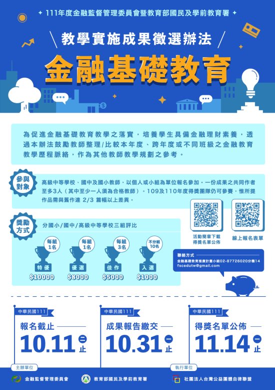 三、 | 如有相關疑問,請逕洽本案「金融基礎教育推廣計畫小組」承辦人:林書寧,聯絡電話:(02)8772-6020分機14或林怡君,連絡電話:0934-302-822。 |