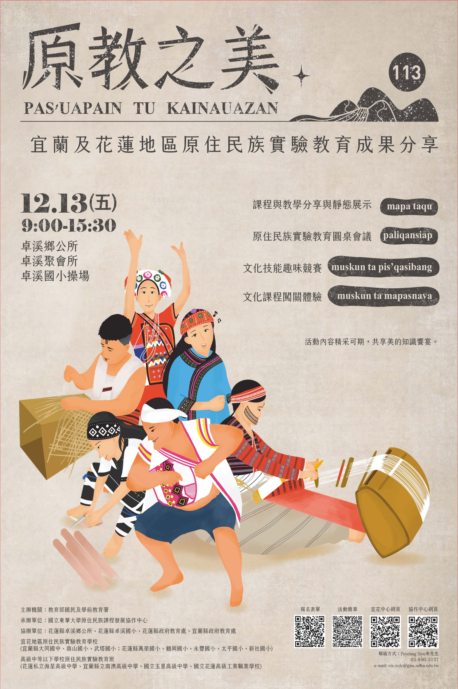 | 二、 | 旨揭活動係由宜蘭及花蓮地區原住民族實驗學校進行課程、教學與學生學習成果分享,並透過文化課程體驗活動之方式,期能促進與會人員對於原住民族實驗教育有更為深入之理解,盼創造聚焦、交流及多元對話的機會,提供相互參照與學習的平台。 |