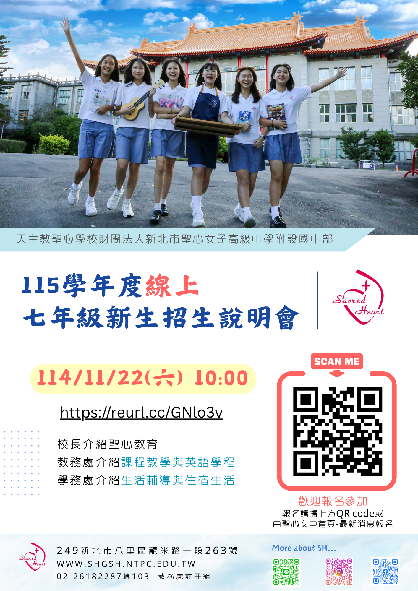 | (二) | 聖心女中首頁http://www.shgsh.ntpc.edu.tw—最新消息--115學年度七年級新生線上招生說明會 |