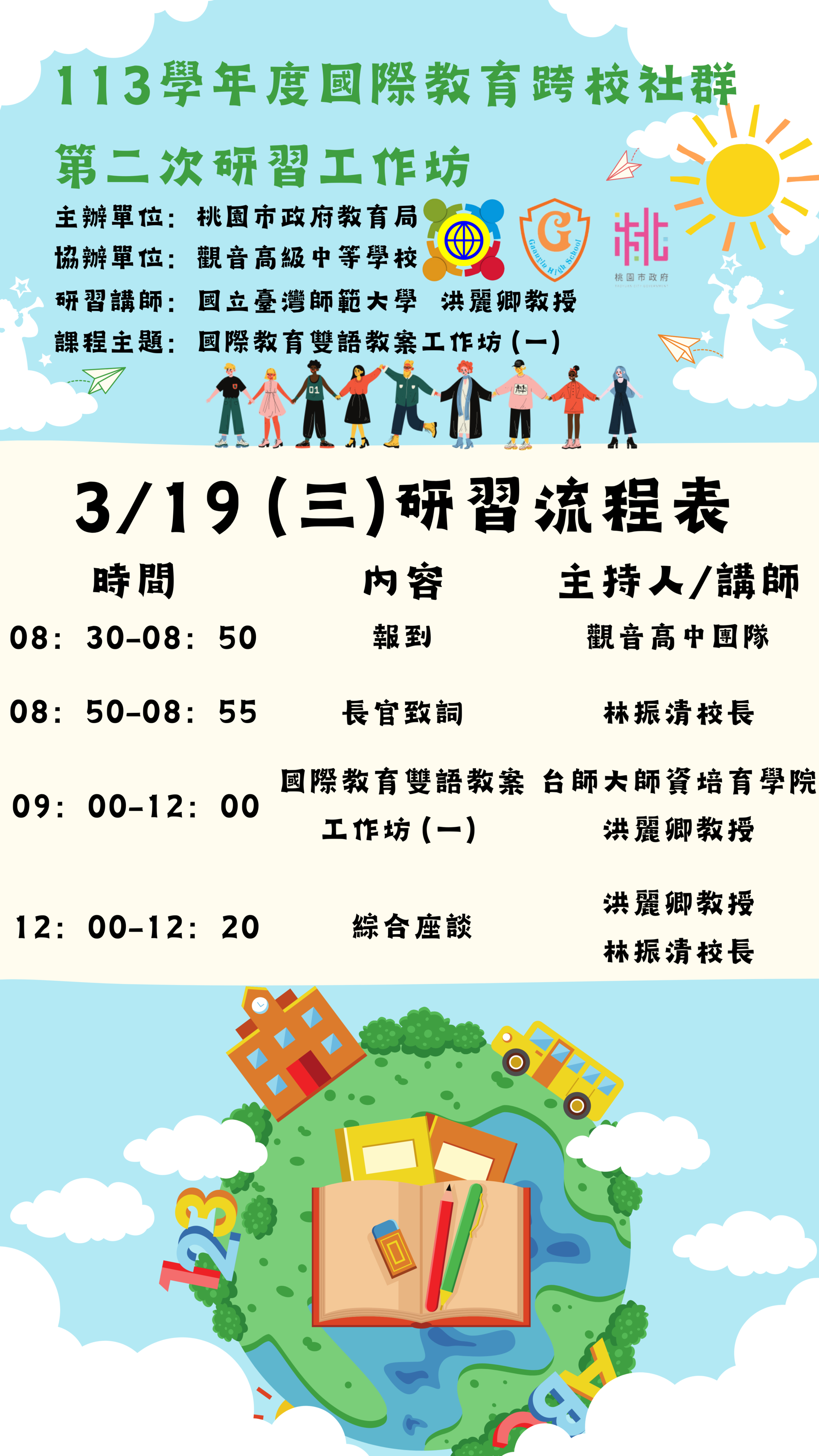 | 二、 | 為促進國際教育資源共享、鼓勵教師跨校合作開發具有創意且實用的國際教育課程或活動設計、強化跨文化與在地文化的融合與理解,特於113年成立桃園市國際教育跨校社群。 |