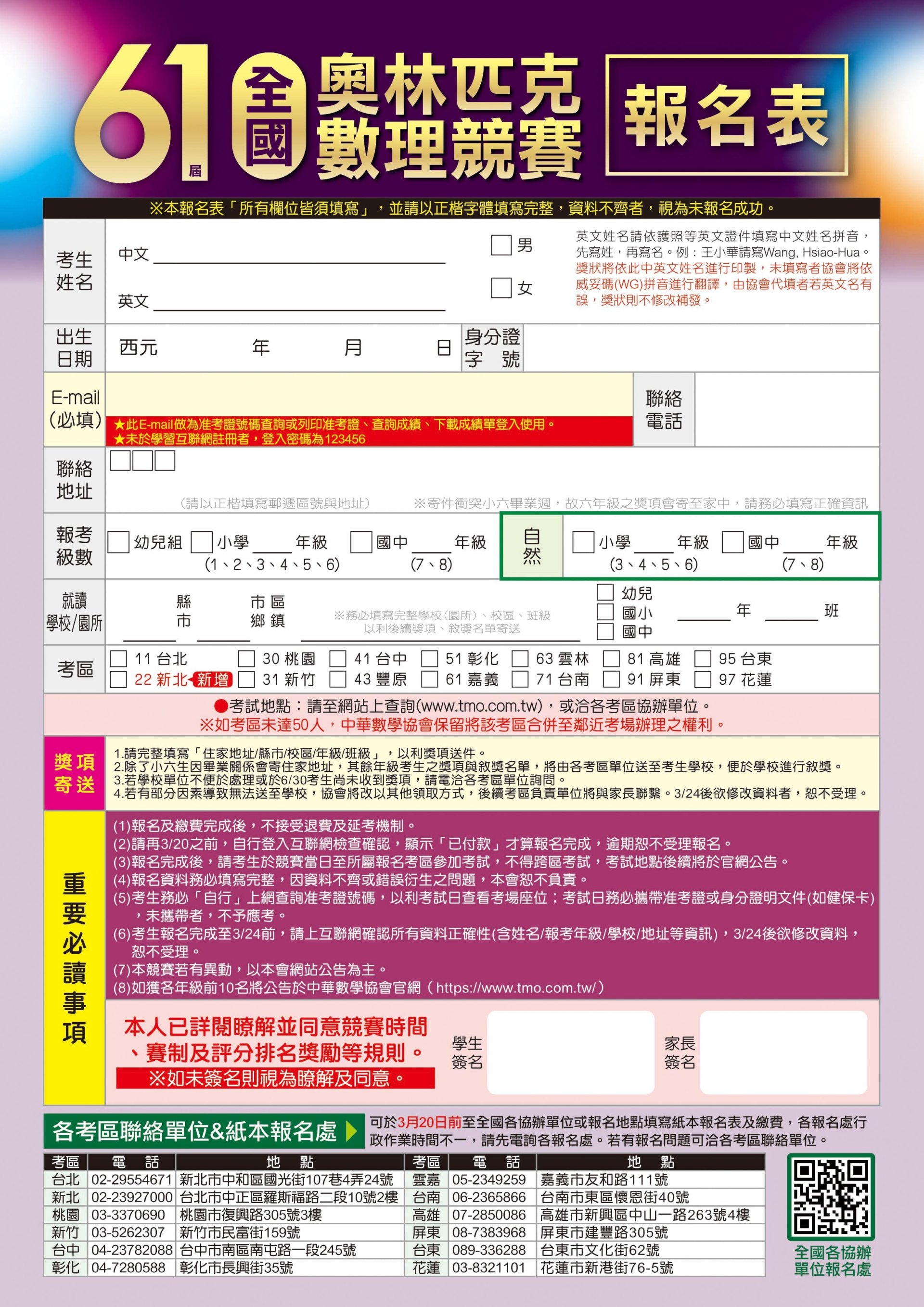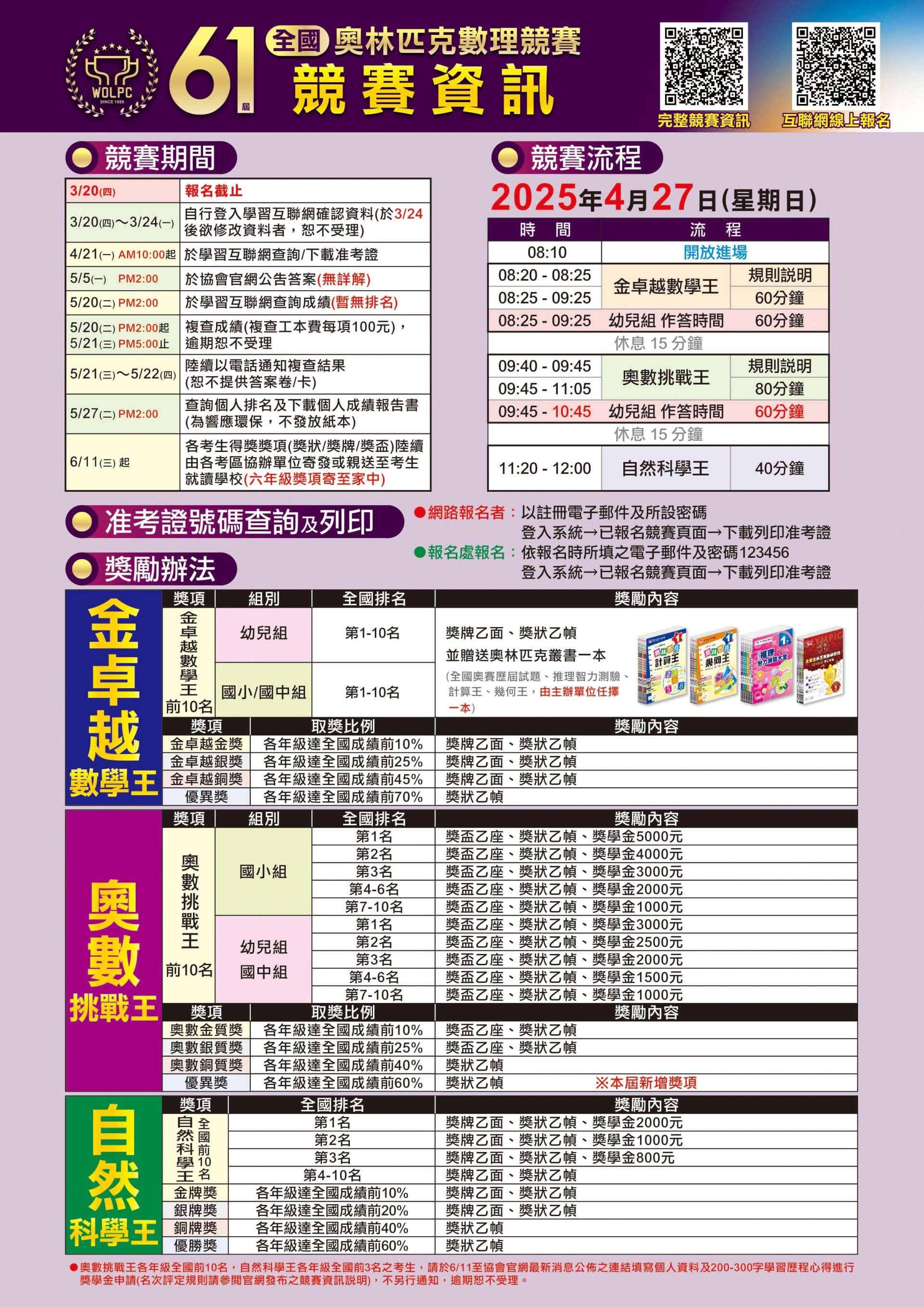 | 二、 | 檢附「第61屆全國奧林匹克數理競賽」競賽活動簡章,供 貴校參閱。 |