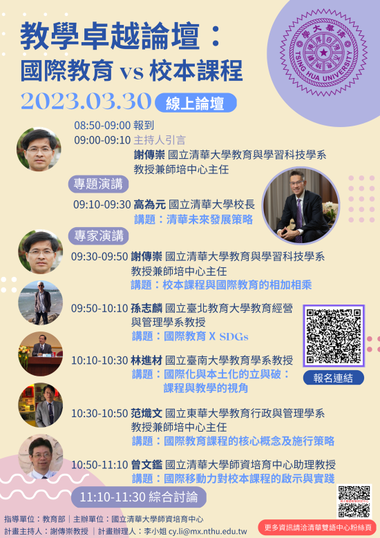 一、 | 旨揭線上論壇以「教學卓越:國際教育 vs 校本課程」為主題,特邀請國立清華大學校長高為元演講,藉由專家學者探索教育理論與實務,期許透過國際教育與校本課程的連結,使學生及學校當局可以立足在地,學習國際、放眼全球,而照亮國際教育的校本課程發展之路,培育學生成為具備全球移動力與競合力之國際化人才。 |